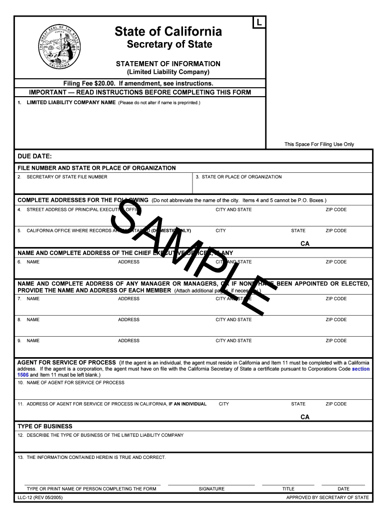 Starting an LLC in California – fees to file $20 fee to file a Statement of Information, Form LLC-12, with the California Secretary of State.