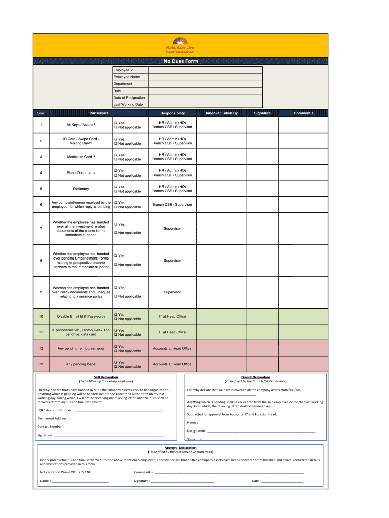 Nonuniform Employee I'd Employee Name Department Role Date of Resignation Last Working Date Particulars No. Handover Taken By Responsibility 1 All Keys / Assets? Yes Not applicable ID Card / Swipe