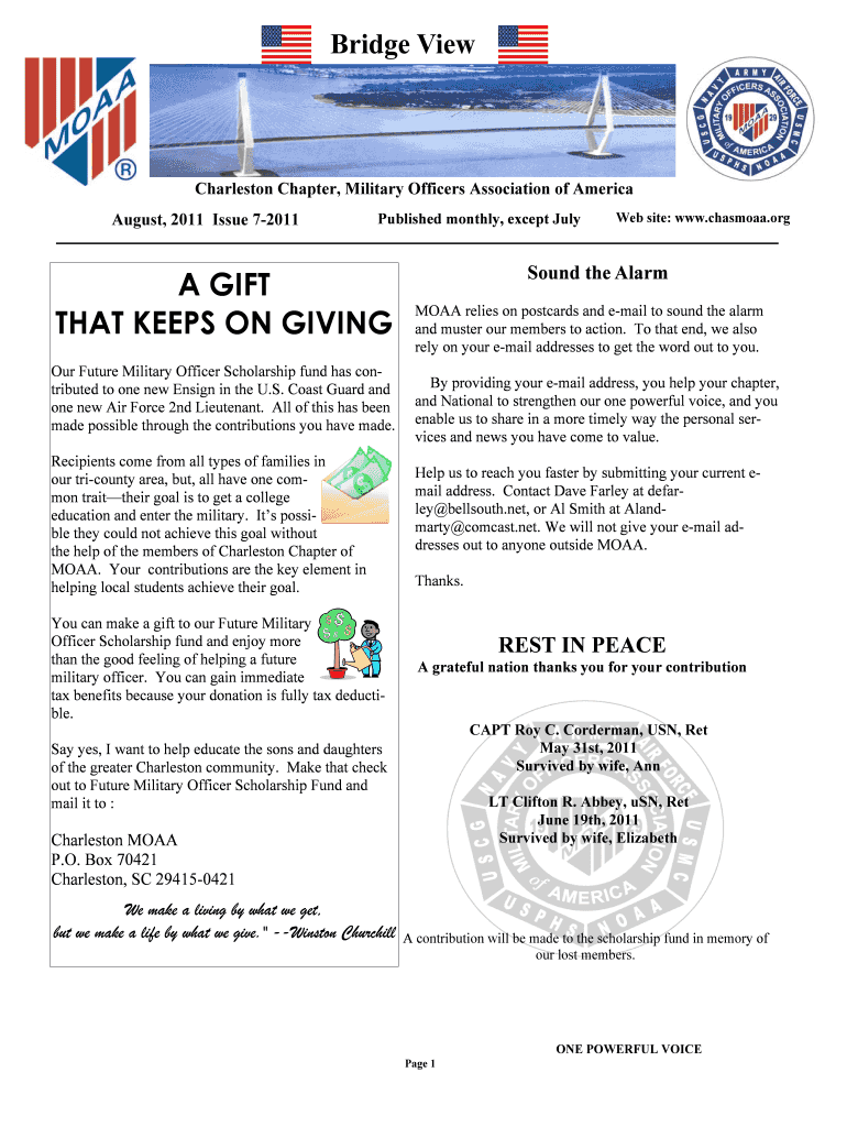 The document serves as a newsletter for the Charleston Chapter of MOAA, providing updates on scholarship funds, legislative matters, in memoriam tributes, upcoming events, and membership details.
