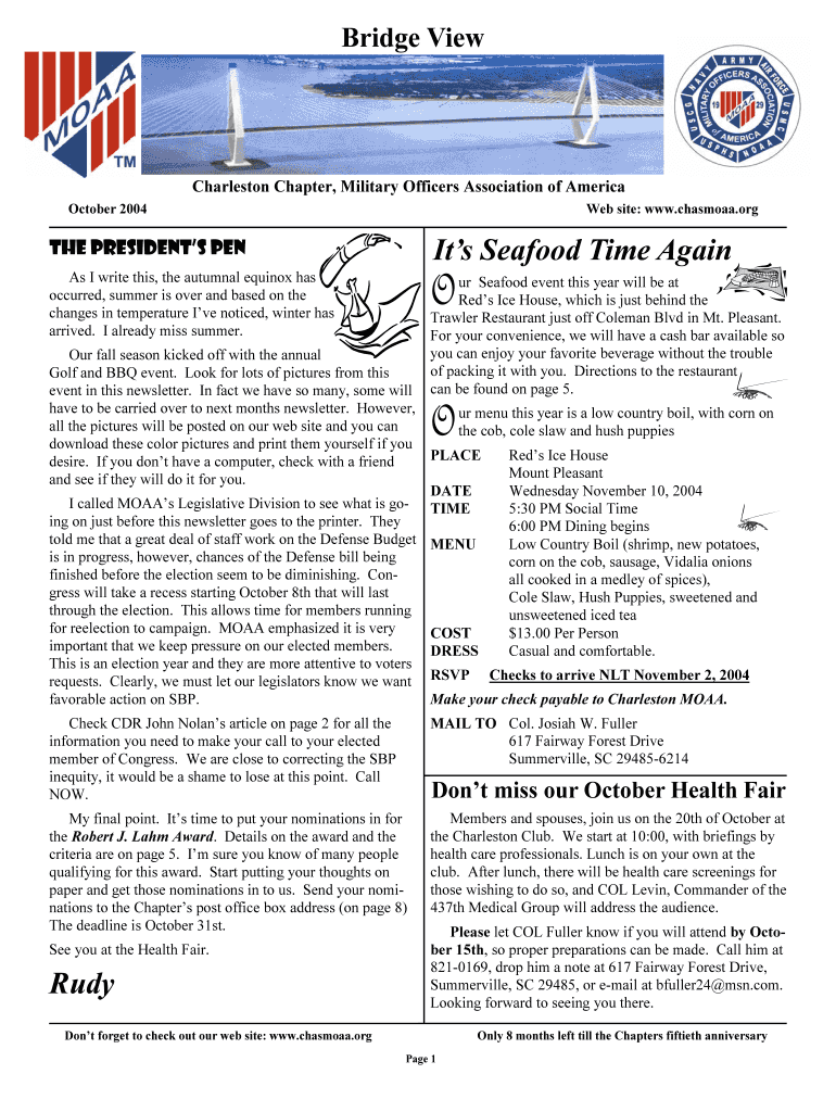 This document is a newsletter for the Charleston Chapter of the Military Officers Association of America, covering events, updates, and information for members, including a seafood event, legislative