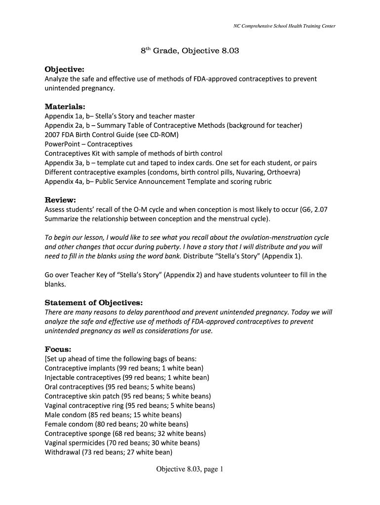 NC Comprehensive School Health Training Center 8th Grade, Objective 8.03 Objective: Analyze the safe and effective use of methods of FDA approved contraceptives to prevent unintended pregnancy. Materials: