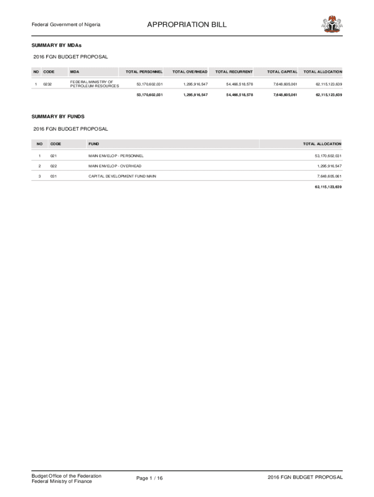 APPROPRIATION BILL Federal Government of NigeriaSUMMARY BY MDS