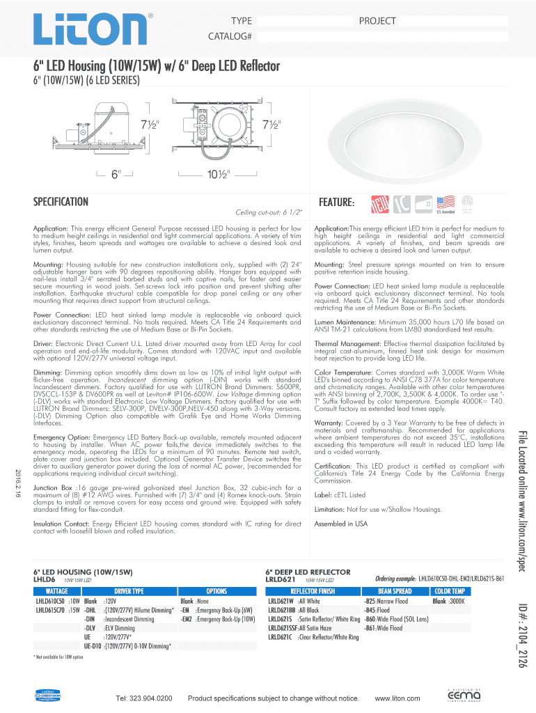 PROJECT INFORMATION TYPE: PROJECT: PROJECT CATALOG#: CATALOG# 6 LED Housing (10W 15W w 6 Deep LED Reflector 6 (10W 15W) (6 LED SERIES) 2 2 2 SPECIFICATION FEATURE: Ceiling cutout: 6 1 2 Application: