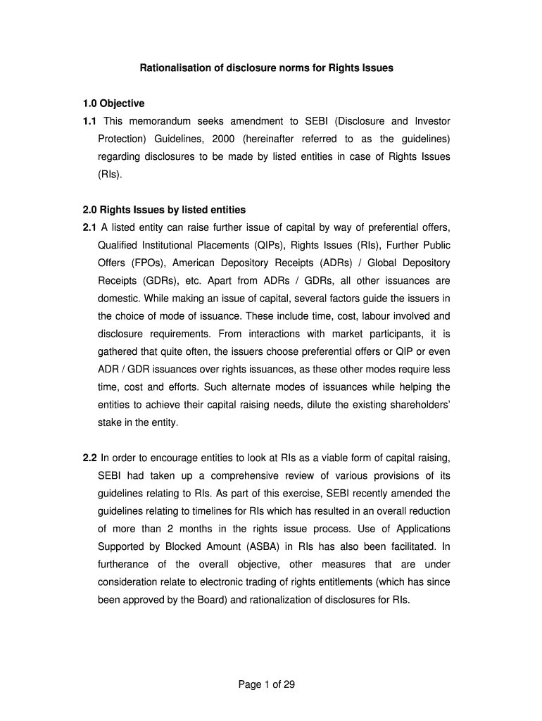 Rationalization of disclosure norms for Rights Issues 1.0 Objective 1.1 This memorandum seeks amendment to SEMI (Disclosure and Investor Protection) Guidelines, 2000 (hereinafter referred to as the