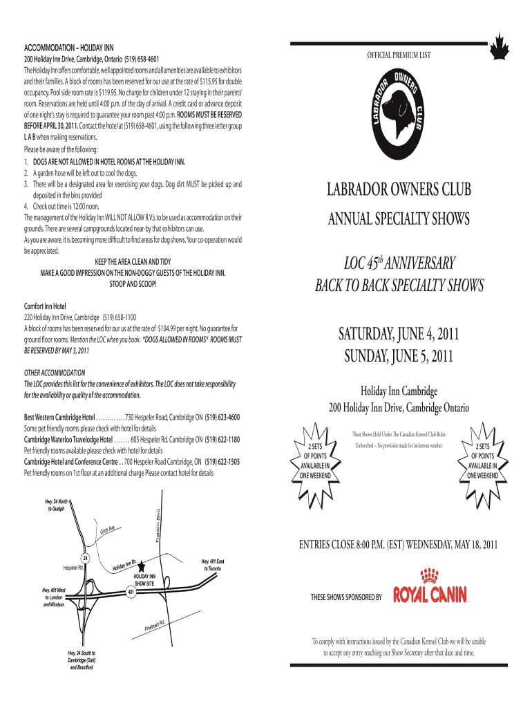 This document provides information regarding accommodation options, event registration, judges, entry fees, and rules for the Labrador Owners Club Specialty Shows scheduled for June 4-5, 2011. It
