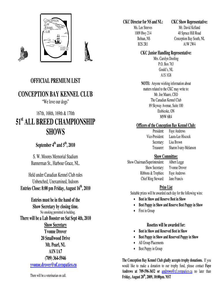 This document provides details about the Conception Bay Kennel Club's All Breed Championship Shows including show dates, contact information, judges, classes, entry fees, and general information.