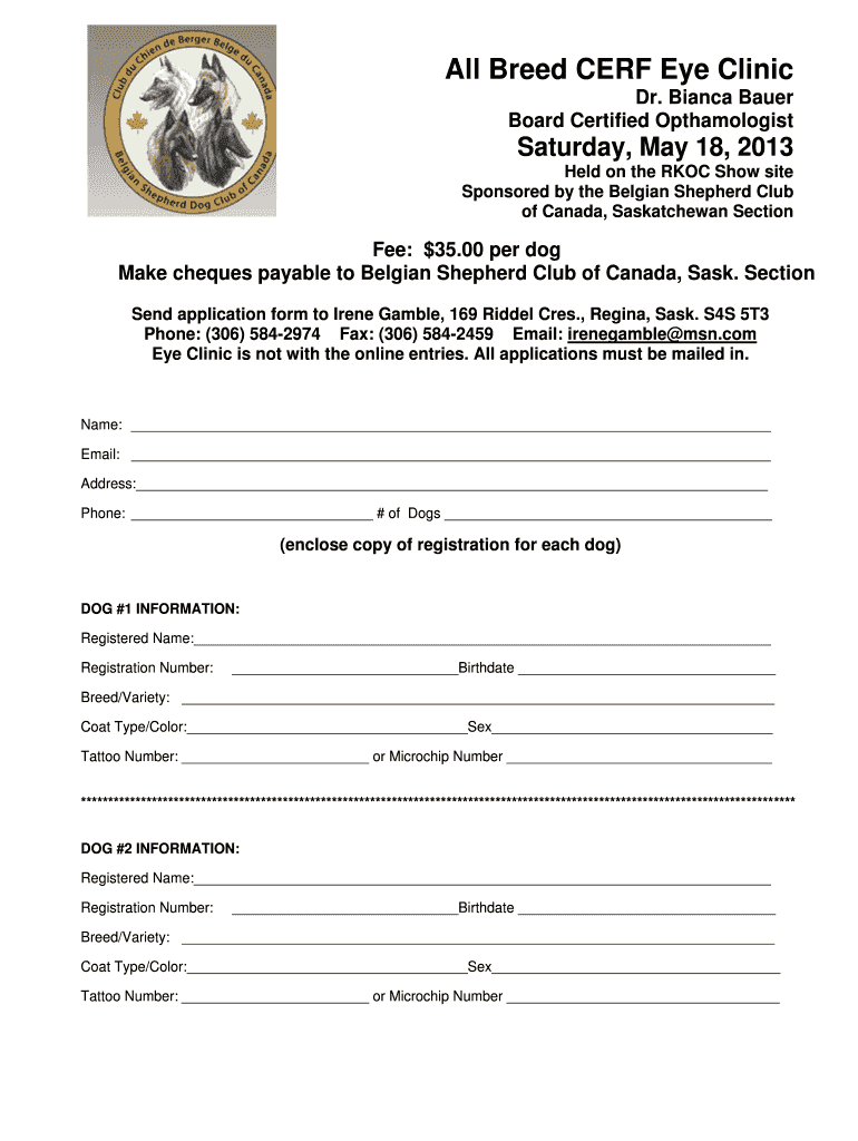 This document is a registration form for the All Breed CERF Eye Clinic conducted by Dr. Bianca Bauer, providing eye examinations for dogs, as part of an event sponsored by the Belgian Shepherd Club