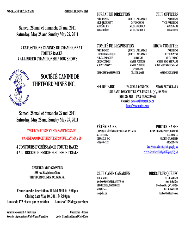 Ce document sert de programme préliminaire pour les expositions canines qui se dérouleront les 28 et 29 mai 2011 à Thetford Mines, incluant des informations sur les comités, les juges, les frais
