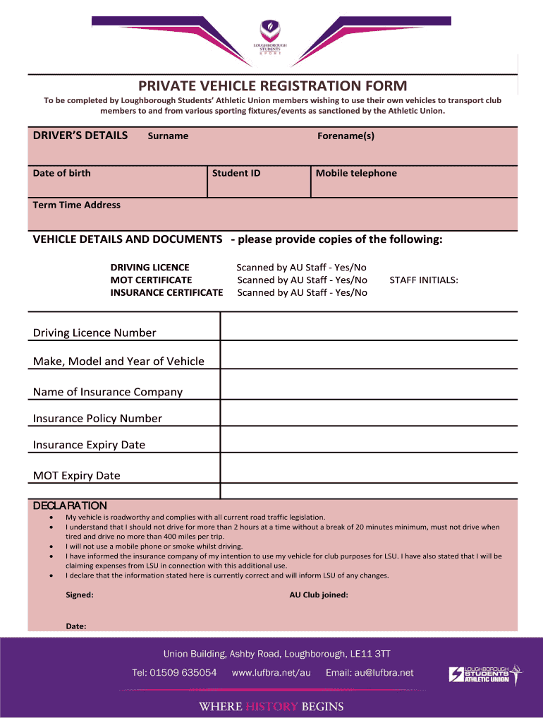 Get the free PRIVATE VEHICLE REGISTRATION FORM - Loughborough Sport