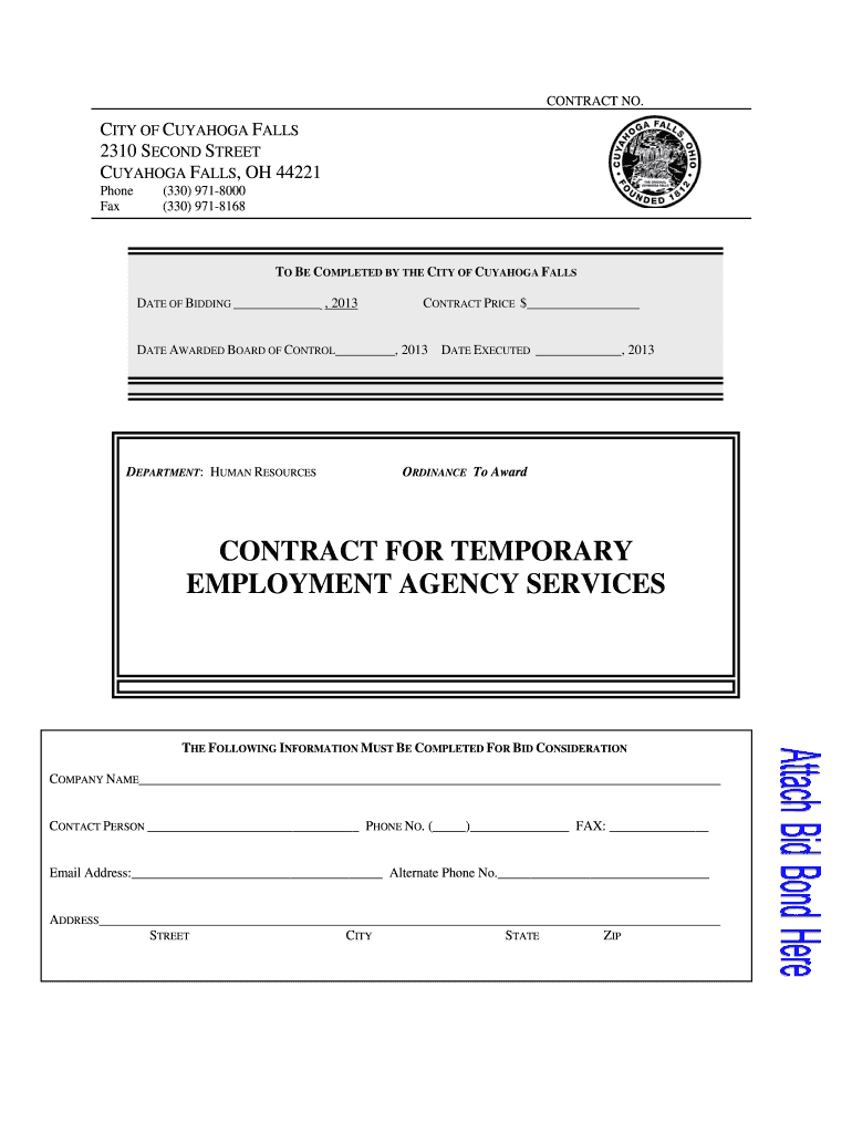 This document outlines the requirements and instructions for submitting bids for temporary employment agency services to the City of Cuyahoga Falls, including legal notices, insurance requirements,