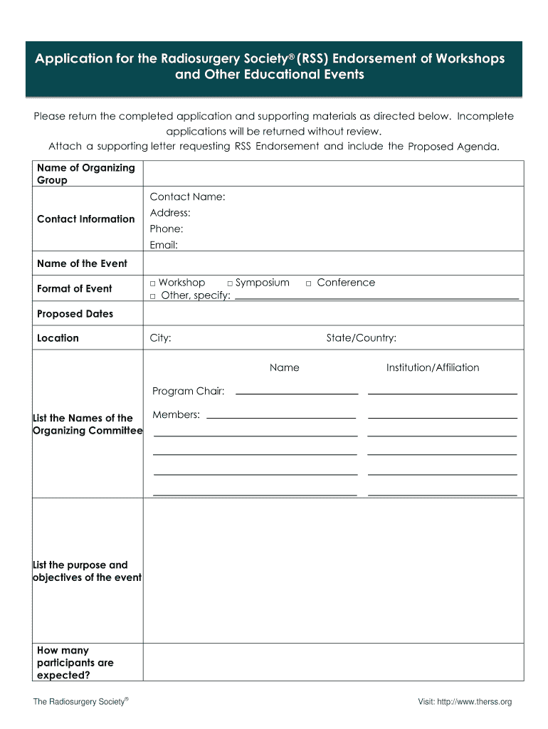 Application for the Radiosurgery Society (RSS) Endorsement of Workshops and Other Educational Events Please return the completed application and supporting materials as directed below. Incomplete