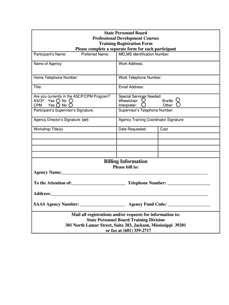 State Personnel Board Professional Development Courses Training Registration Form Please complete a separate form for each participant Participants Name ...