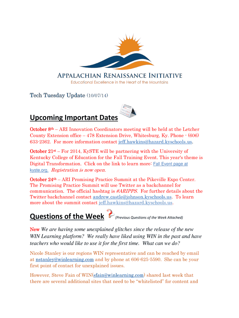 Tech Tuesday Update (10 07/14 Upcoming Important Dates October 8th ARI Innovation Coordinators meeting will be held at the Fletcher County Extension office 478 Extension Drive, Whites burg, Ky. Phone