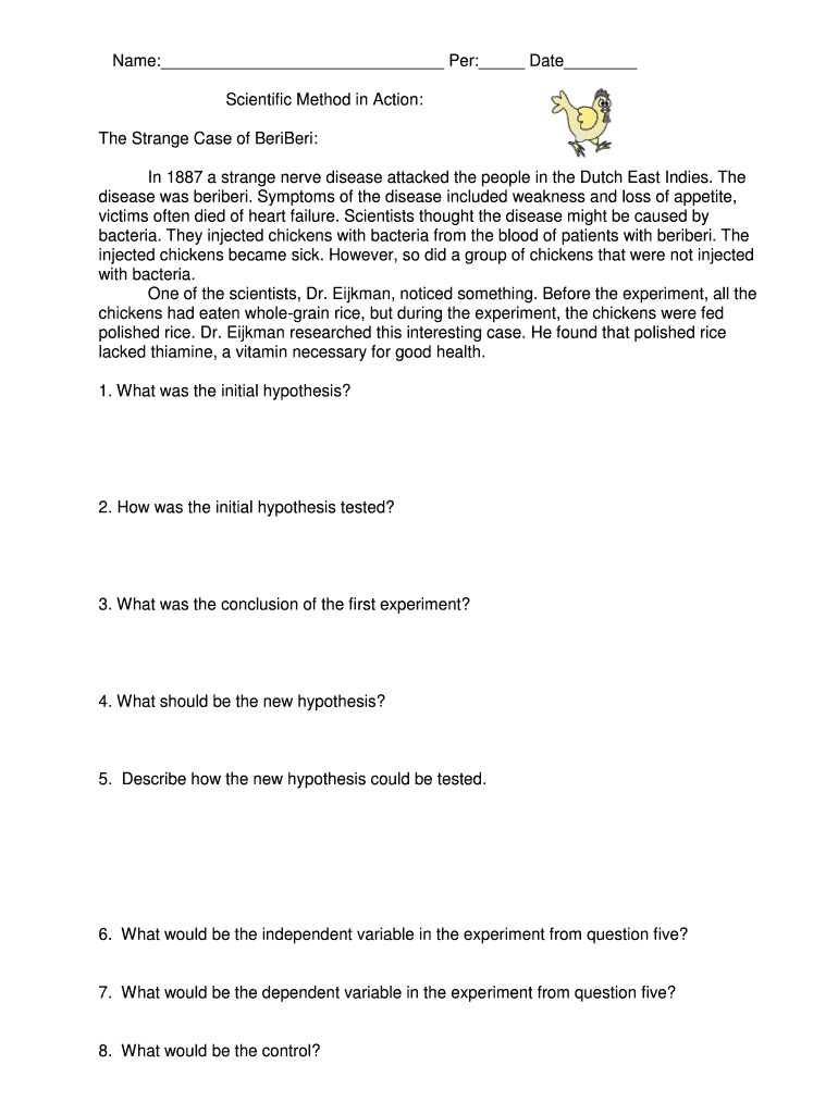 Name: Per: Date Scientific Method in Action: The Strange Case of Beriberi: In 1887 a strange nerve disease attacked the people in the Dutch East Indies. The disease was beriberi. Symptoms of the disease