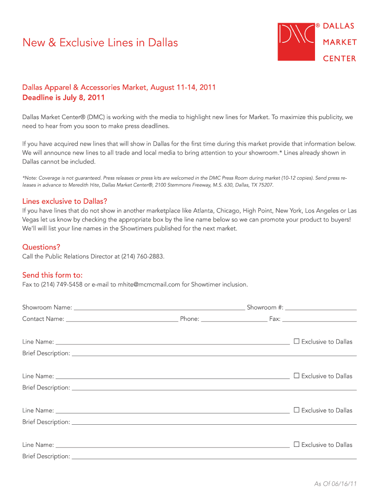 New & Exclusive Lines in Dallas Apparel & Accessories Market, August 1114, 2011 Deadline is July 8, 2011, Dallas Market Center (DMC) is working with the media to highlight new lines for Market. To