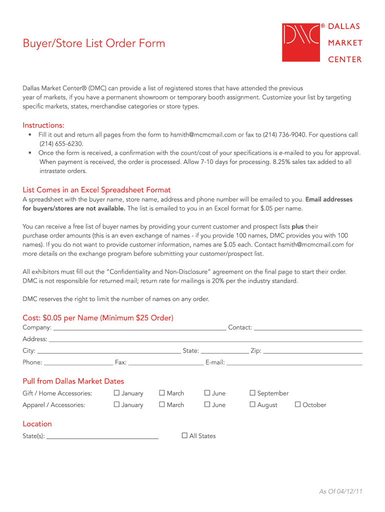 Buyer Store List Order Form Dallas Market Center (DMC) can provide a list of registered stores that have attended the previous year of markets, if you have a permanent showroom or temporary booth