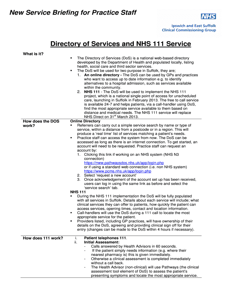 New Service Briefing for Practice Staff Directory of Services and NHS 111 Service What is it? How does the DOS work? How does 111 work? The Directory of Services (DoS) is a national web based directory