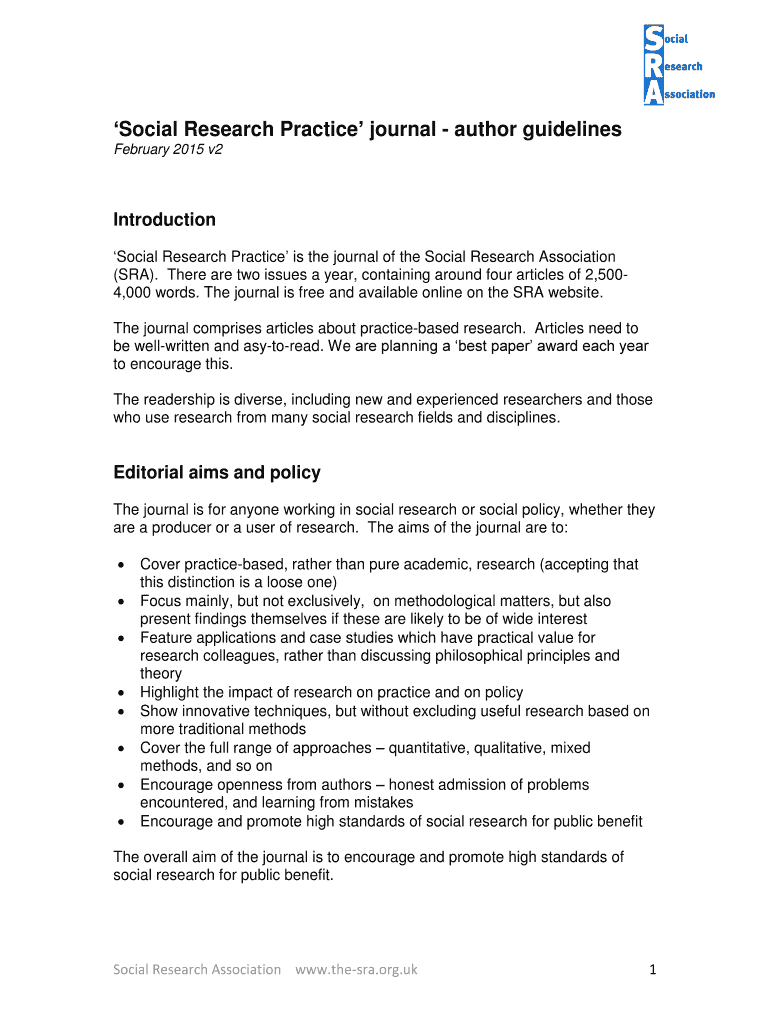 Social Research Practice journal author guidelines February 2015 v2 Introduction Social Research Practice is the journal of the Social Research Association (SRA×. There are two issues a year, containing