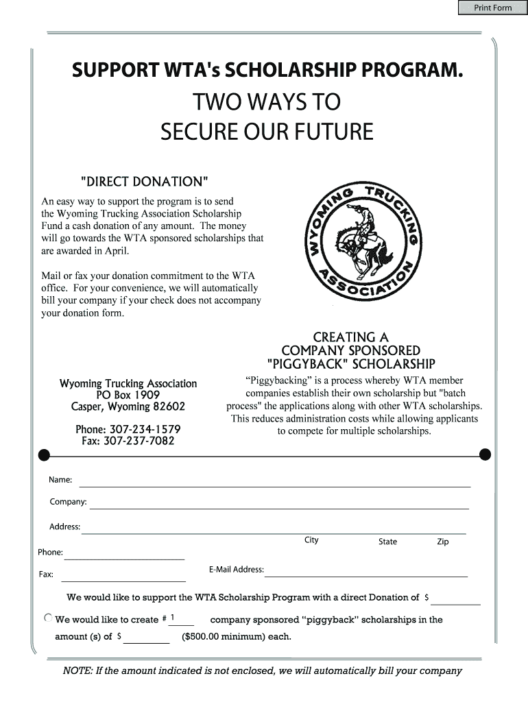 Print Form SUPPORT WTA's SCHOLARSHIP PROGRAM. TWO WAYS TO SECURE OUR FUTURE DIRECT DONATION An easy way to support the program is to send the Wyoming Trucking Association Scholarship Fund a cash donation