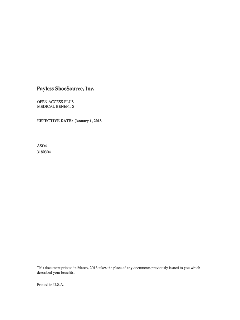 Payless Resource, Inc. OPEN ACCESS PLUS MEDICAL BENEFITS EFFECTIVE DATE: January 1, 2013 ASO4 3180304 This document printed in March 2013 takes the place of any documents previously issued to you