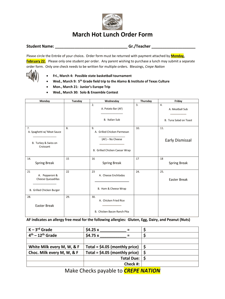 The March hot lunch order can be filled out by selecting the desired meals for each day of the month and submitting the form by the deadline.