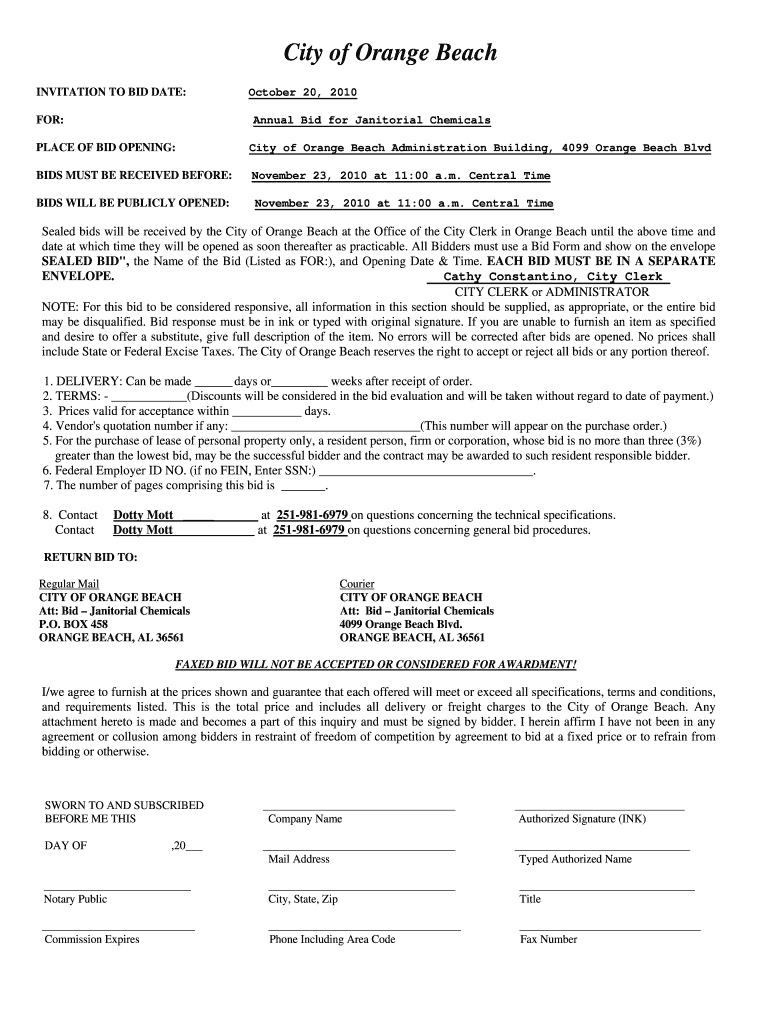 Get the free Annual bid for janitorial chemicals - City of Orange Beach