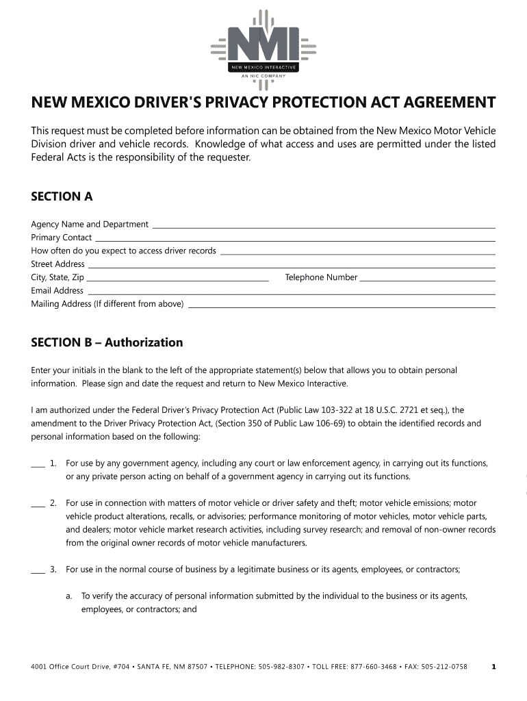 NEW MEXICO DRIVER IS PRIVACY PROTECTION ACT AGREEMENT This request must be completed before information can be obtained from the New Mexico Motor Vehicle Division driver and vehicle records. Knowledge