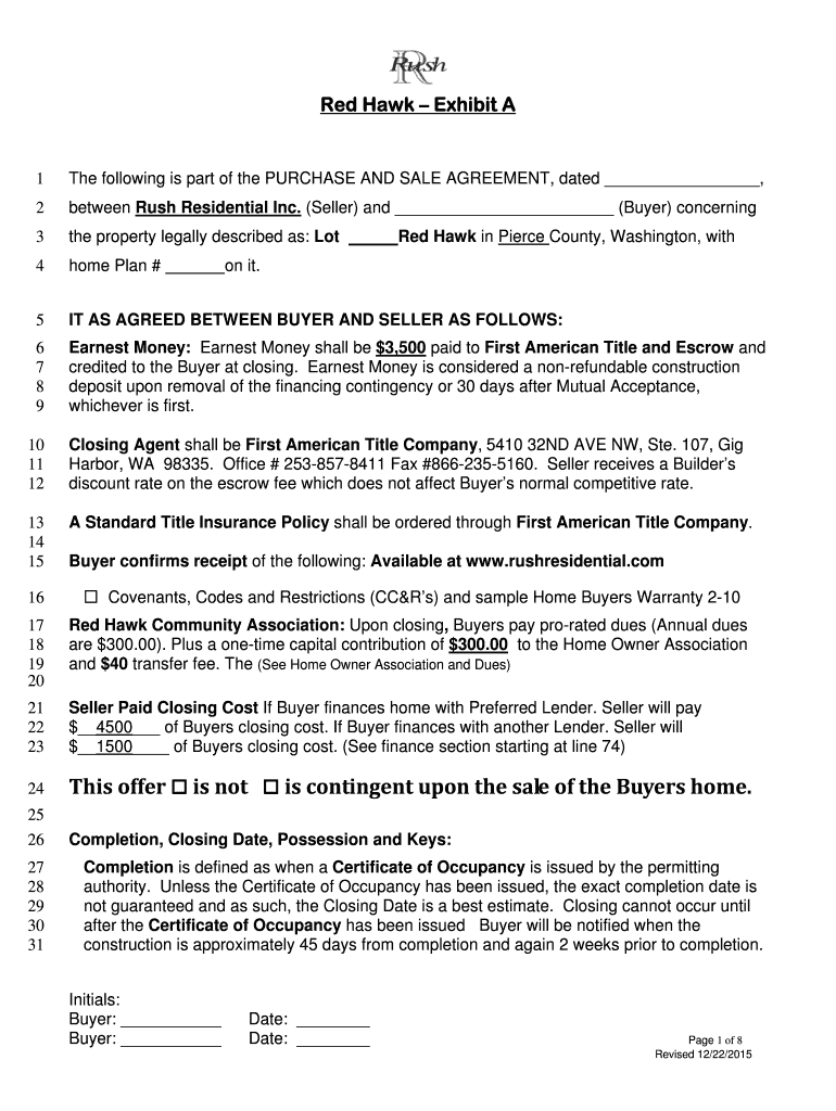 Red Hawk Exhibit A 1 The following is part of the PURCHASE AND SALE AGREEMENT, dated, 2 between Rush Residential Inc. (Seller) and (Buyer) concerning 3 the property legally described as: Lot 4 home