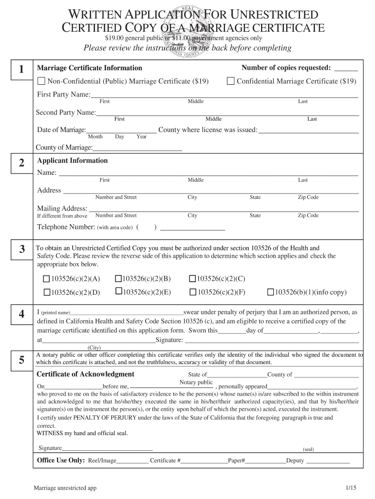 Print WRITTEN APPLICATION FOR UNRESTRICTED CERTIFIED COPY OF A MARRIAGE CERTIFICATE Clear Form $19.00 public or $11.00 government agencies only Please review the instructions on the back before completing