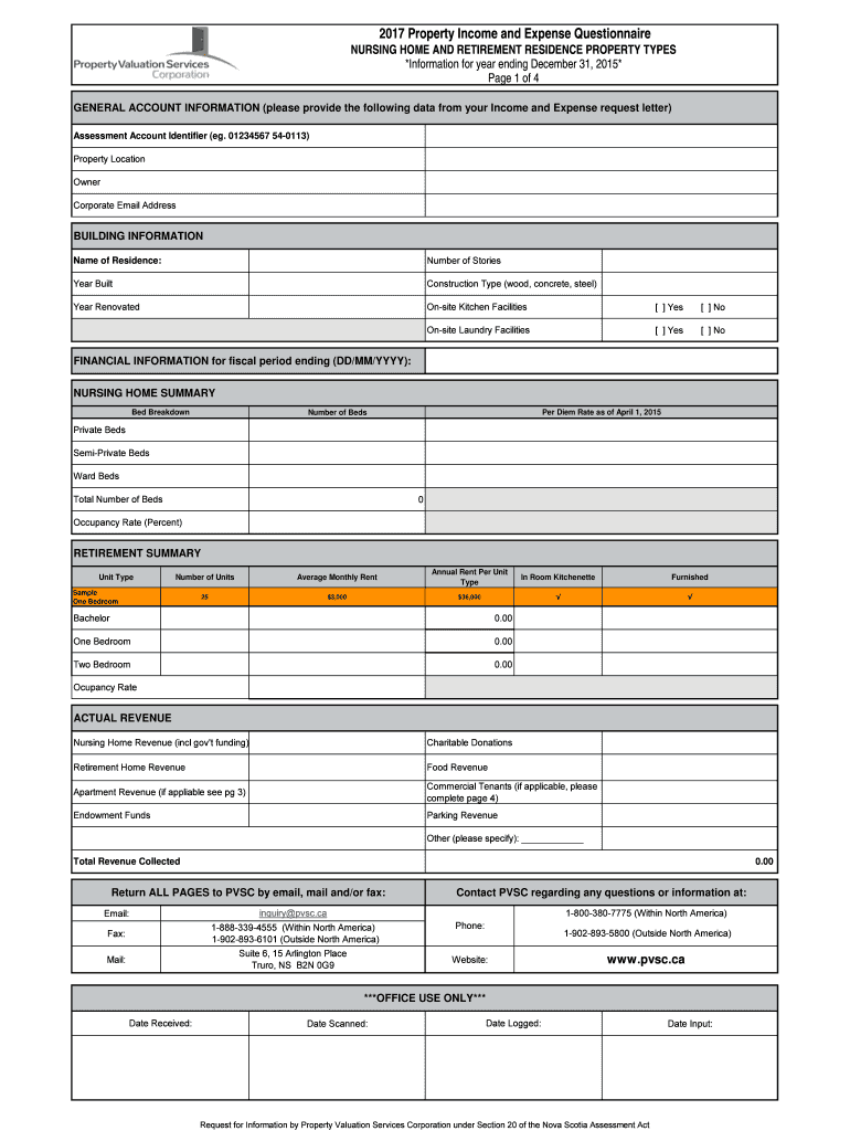 2017 Property Income and Expense Questionnaire NURSING HOME AND RETIREMENT RESIDENCE PROPERTY TYPES *Information for year ending December 31, 2015* Page 1 of 4 GENERAL ACCOUNT INFORMATION (please