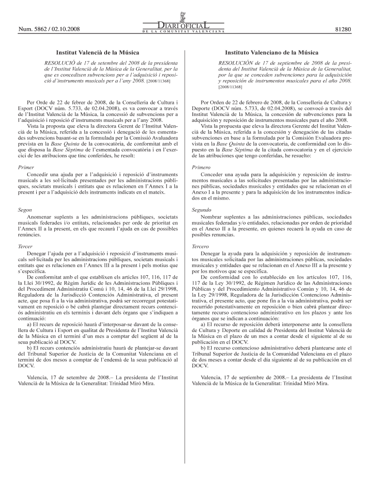 Sum. 5862 02.10.2008 Institute Valencia de la Mica RESOLUTE DE 17 de September Del 2008 DE la president DE institute Valencia de la Mica DE la Generality, per la Que BS conceived subventions per a