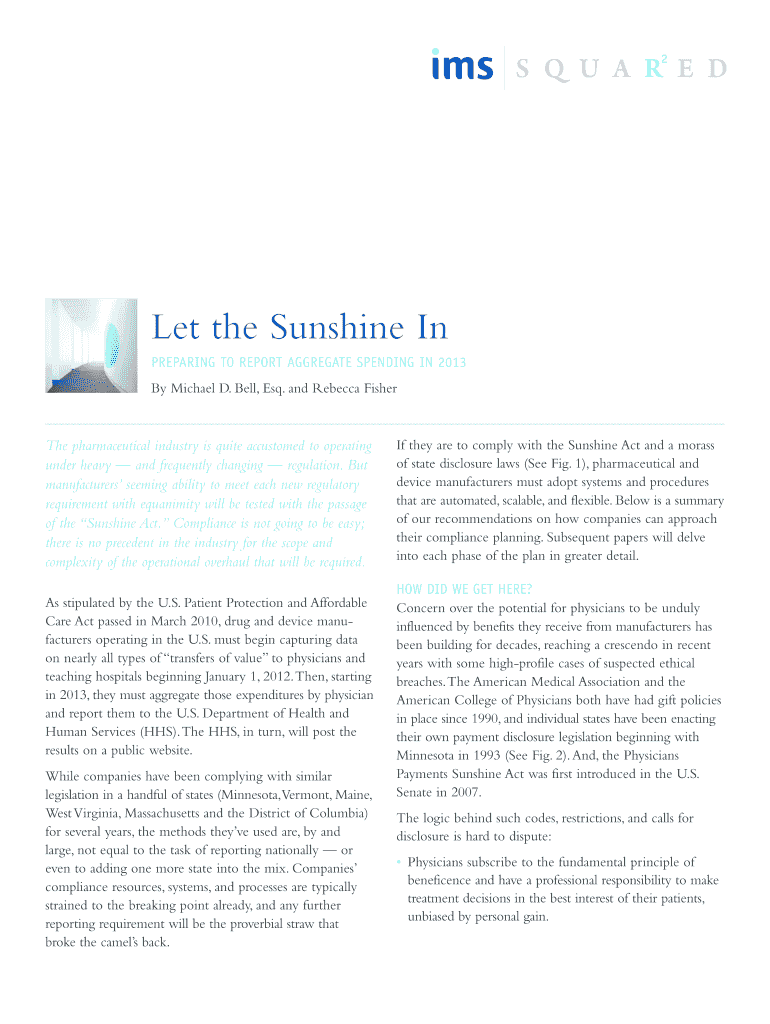 Let the Sunshine In PREPARING TO REPORT AGGREGATE SPENDING IN 2013 By Michael D. Bell, Esq. And Rebecca Fisher The pharmaceutical industry is quite accustomed to operating under heavy and frequently