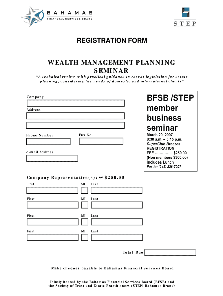 A registration form for a seminar focused on estate planning, addressing recent legislation and the needs of both domestic and international clients.