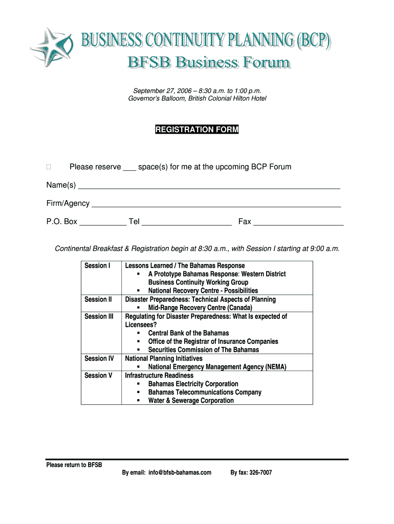 This document serves as a registration form for the BCP Forum scheduled on September 27, 2006, detailing the sessions and requesting participant information.