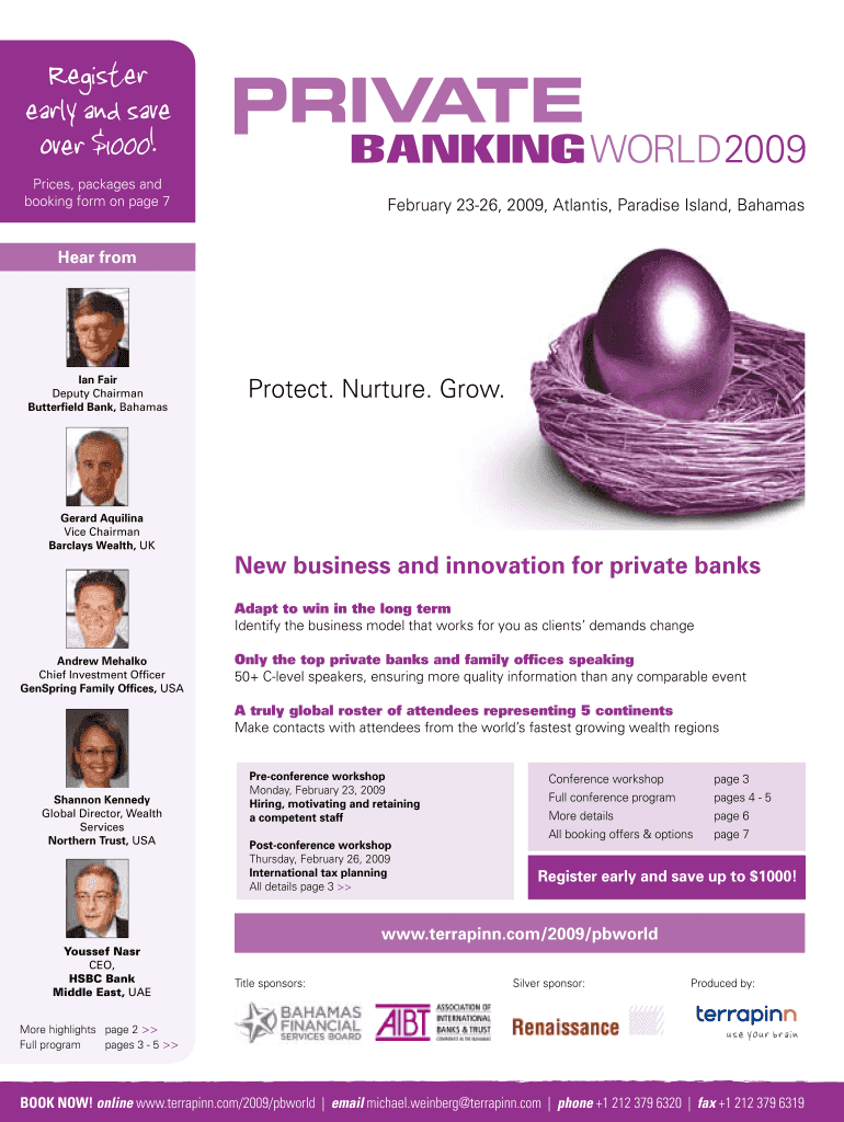 This document provides details about the Private Banking World 2009 conference scheduled to be held from February 23-26, 2009, at Atlantis, Paradise Island, Bahamas. It includes information about