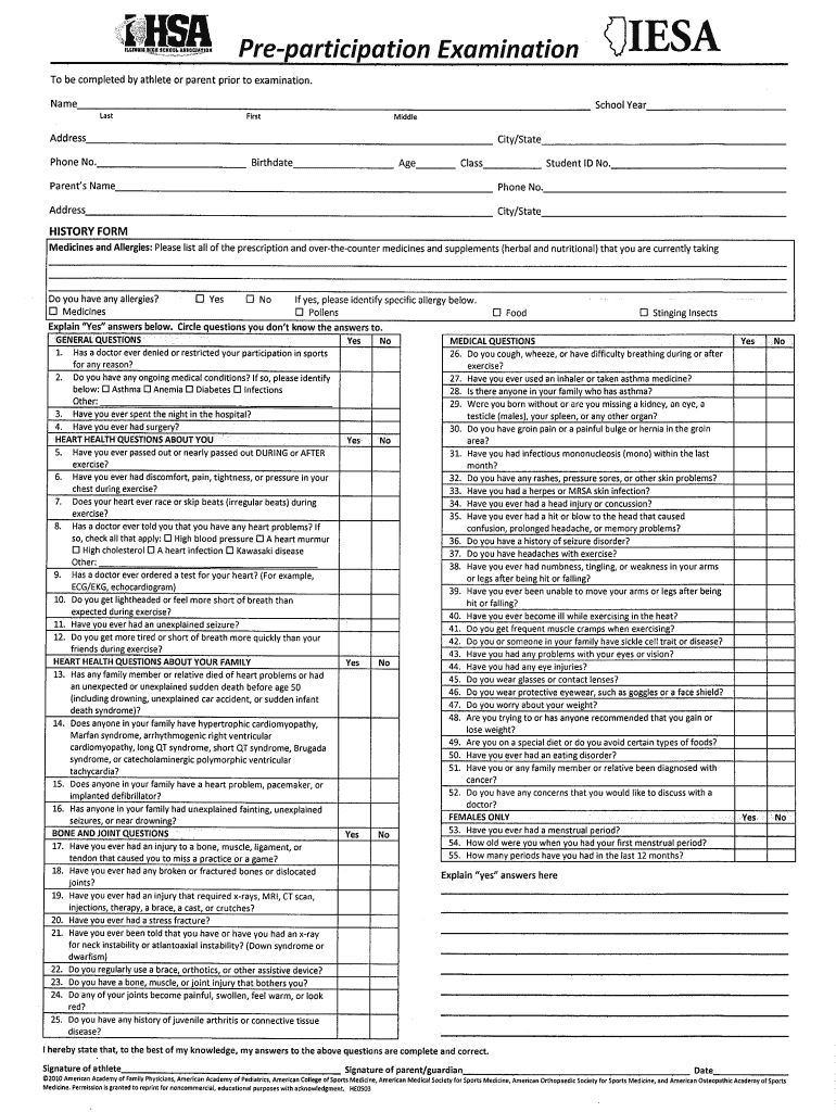 Participation Examination QI ESA To be completed by athlete or parent prior to examination. Name, School Year last First Middle Address City×State 'Phone No. Birthdate Age Class. Student ID No. Parent's