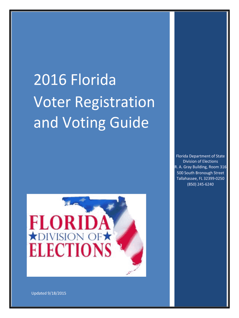 2016 Florida Voter Registration and Voting Guide Florida Department of State Division of Elections R. A. Gray Building, Room 316 500 South Borough Street Tallahassee, FL 323990250 850) 2456240Updated