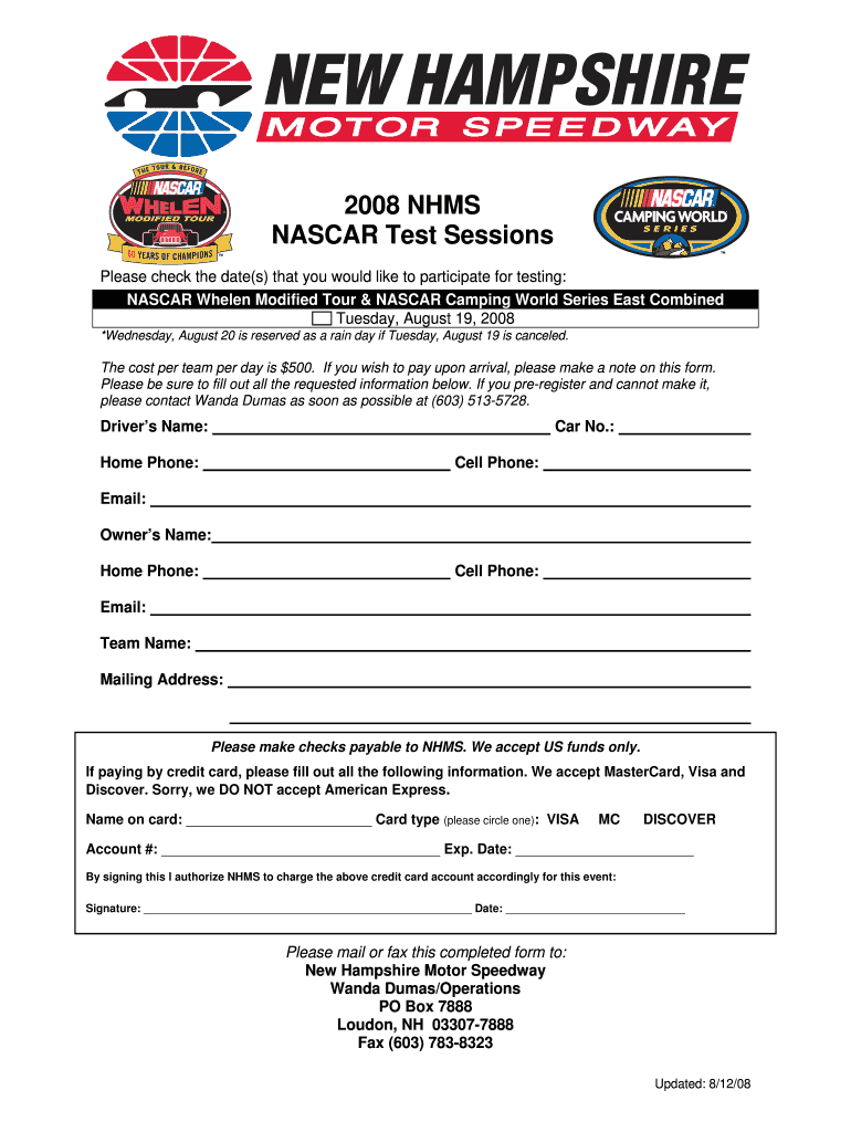 2008 NHS NASCAR Test Sessions Please check the date s) that you would like to participate for testing: NASCAR Helen Modified Tour & NASCAR Camping World Series East Combined Tuesday, August 19, 2008