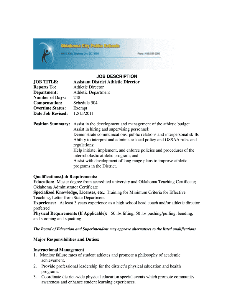 Get the free JOB DESCRIPTION JOB TITLE Assistant District Athletic - okcps1 schooldesk