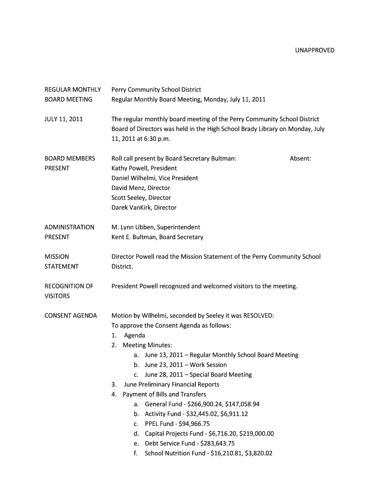 Get the free UNAPPROVED BOARD MEETING Regular Monthly Board Meeting - perry k12 ia