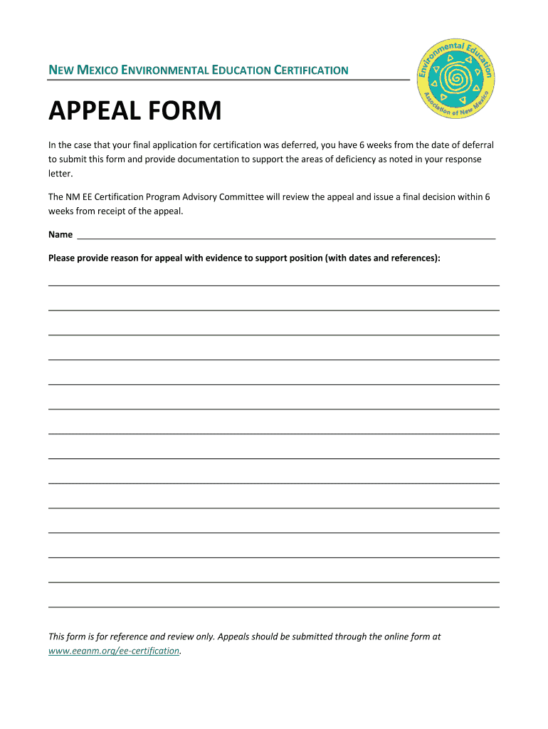 NEW MEXICO ENVIRONMENTAL EDUCATION CERTIFICATION APPEAL FORM In the case that your final application for certification was deferred, you have 6 weeks from the date of deferral to submit this form
