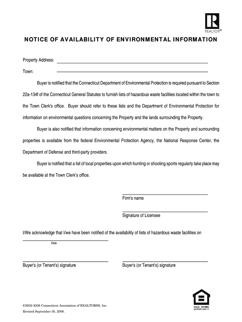 NOTICE OF AVAILABILITY OF ENVIRONMENTAL INFORMATION Property Address: Town: Buyer is notified that the Connecticut Department of Environmental Protection is required pursuant to Section 22a134f of