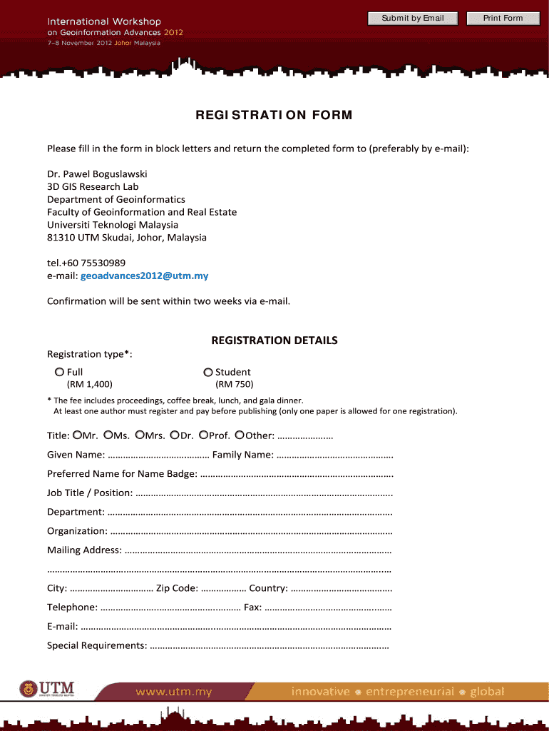 This document is a registration form for participants to register for an event held by the 3D GIS Research Lab at Universiti Teknologi Malaysia. It includes details for filling out registration information,