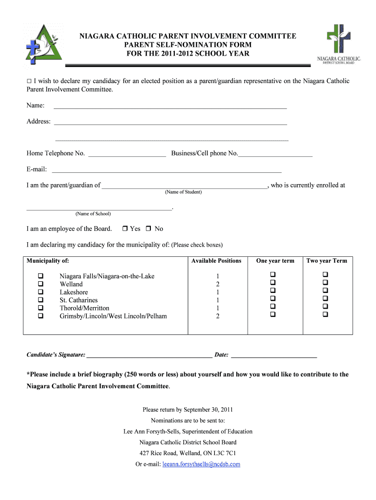 NIAGARA CATHOLIC PARENT INVOLVEMENT COMMITTEE PARENT DENOMINATION FORM FOR THE 20112012 SCHOOL YEAR I wish to declare my candidacy for an elected position as a parent×guardian representative on the
