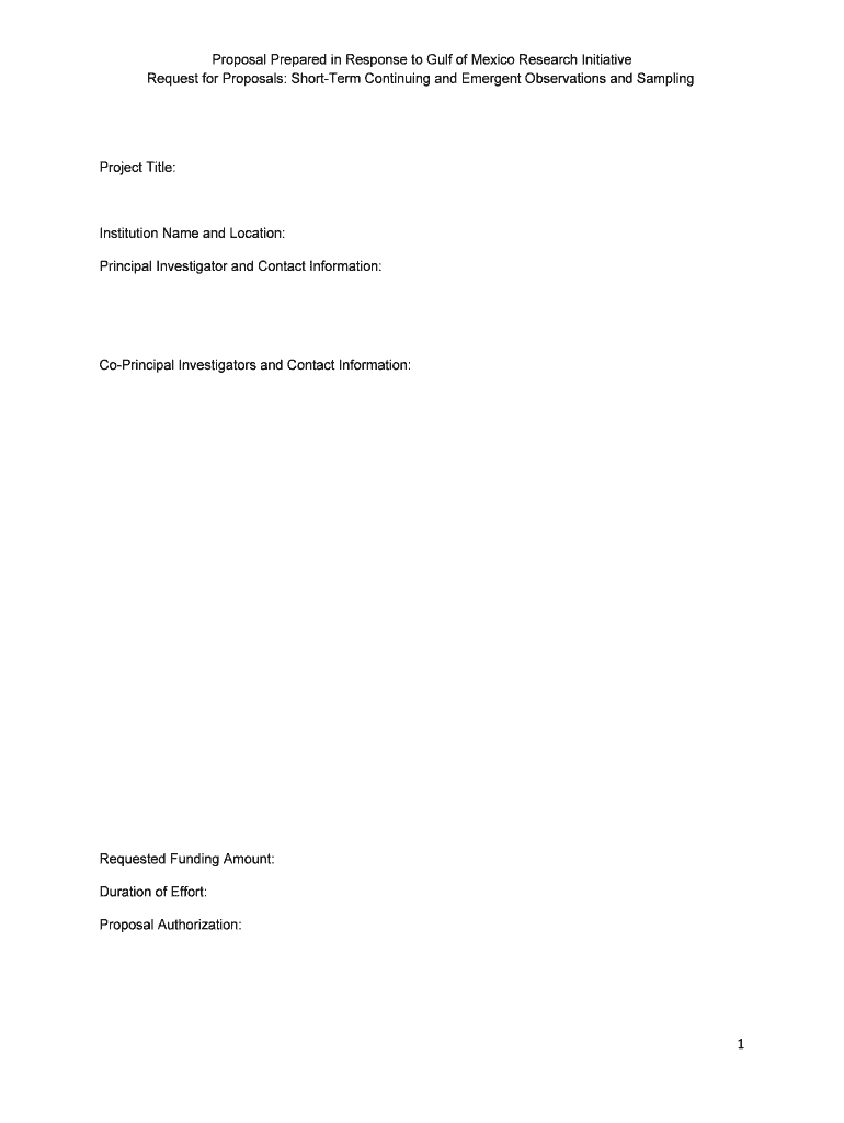 Proposal Prepared in Response to Gulf of Mexico Research Initiative Request for Proposals: Shorter Continuing and Emergent Observations and Sampling Project Title: Institution Name and Location: Principal