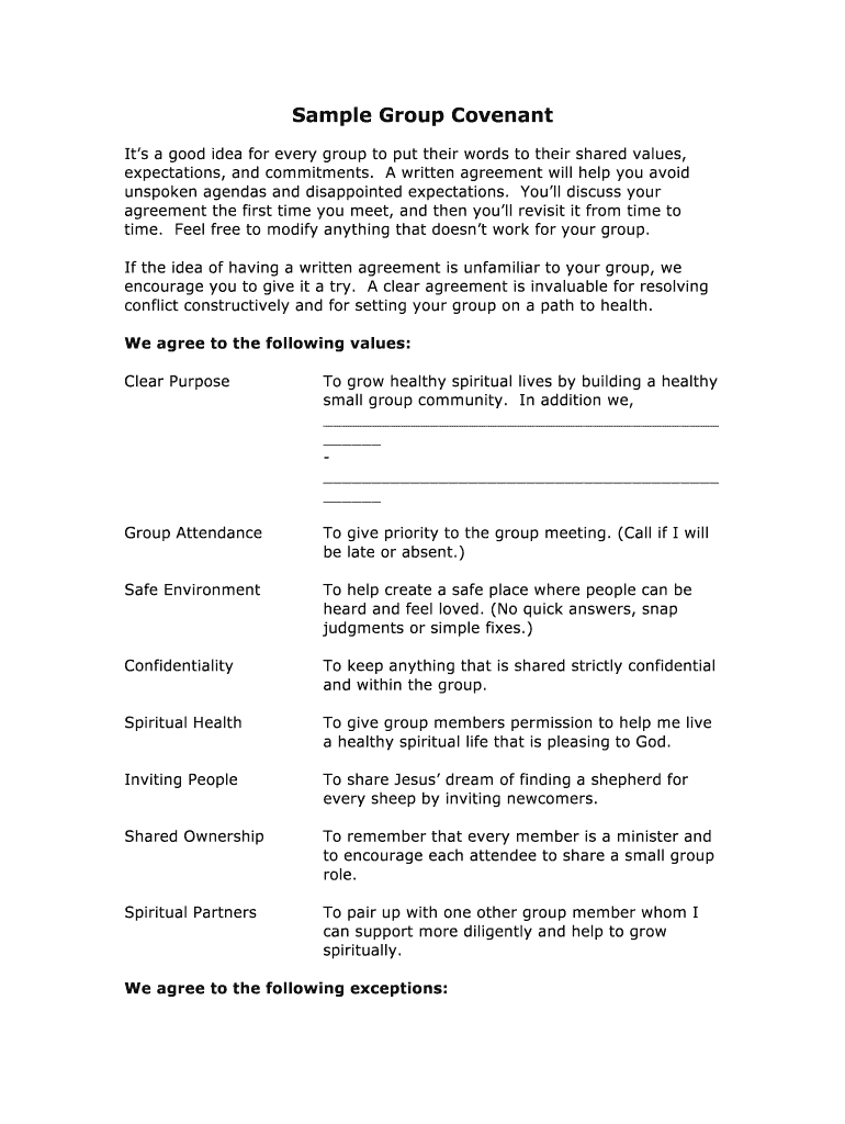 Faith-based communities: Churches, religious groups, or spiritual communities often have smaller groups or ministries within them. A sample group covenant can help maintain unity, define shared values, and establish guidelines for group activities within the larger community.