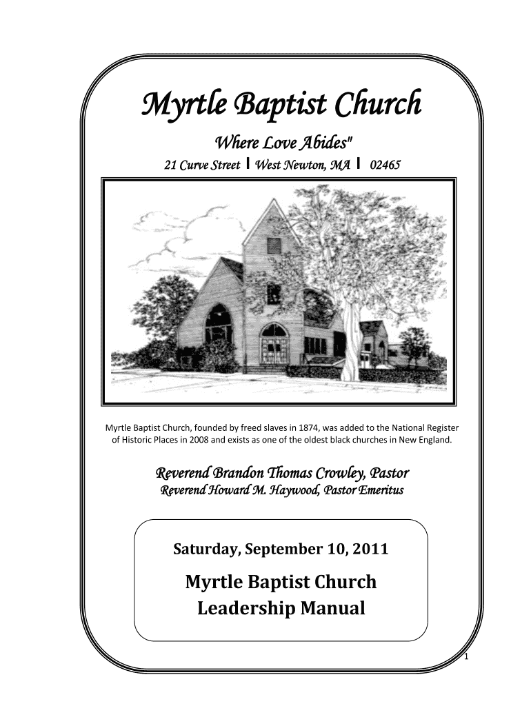 Myrtle Baptist Church Where Love Abides Church 21 Curve Street I West Newton, MA I 02465 Myrtle Baptist Church, founded by freed slaves in 1874, was added to the National Register of Historic Places