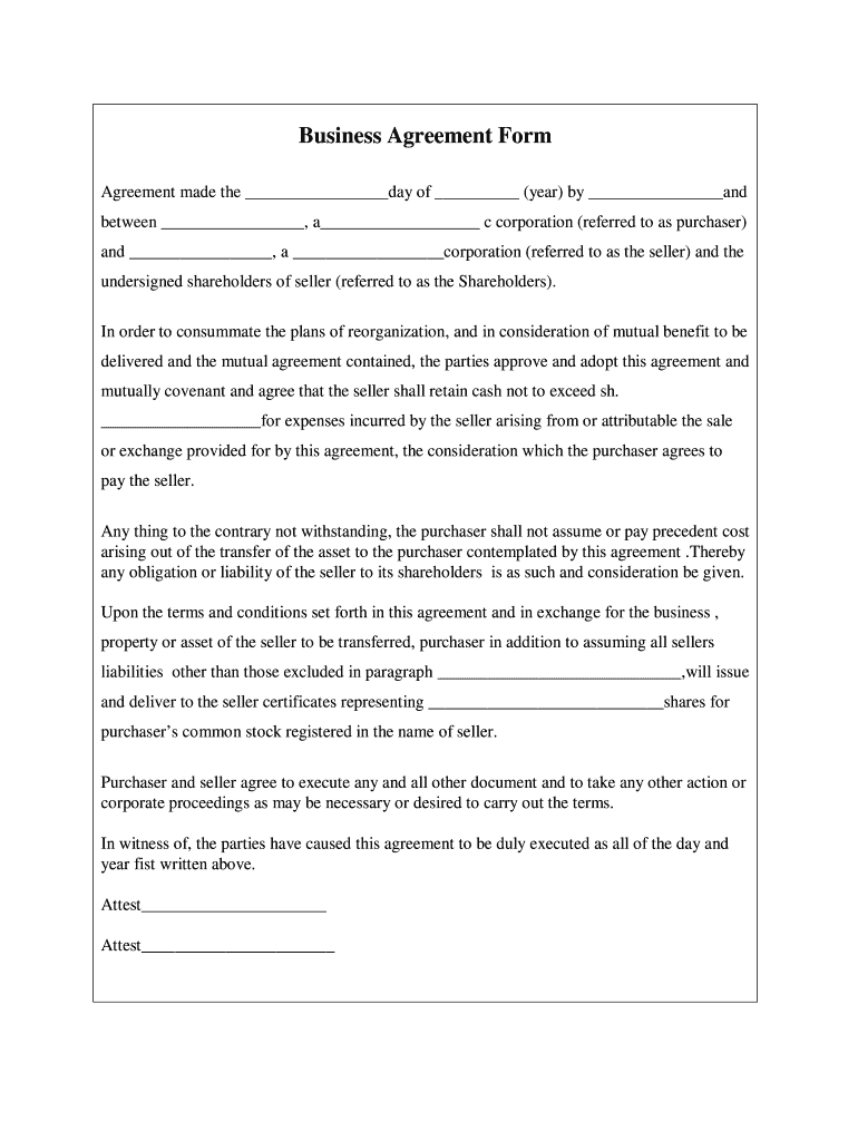 Business Agreement Form Agreement made the day of (year) by and between, a c corporation (referred to as purchaser) and, a corporation (referred to as the seller) and the undersigned shareholders