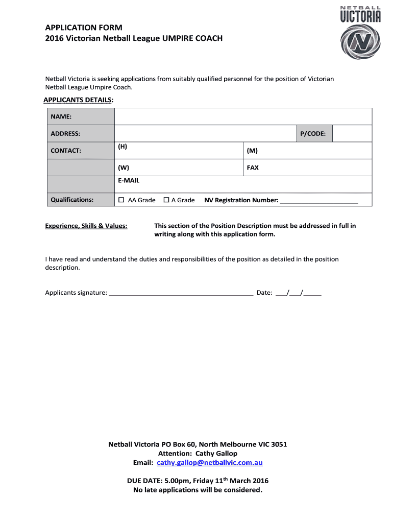 APPLICATION FORM 2016 Victorian Netball League UMPIRE COACH Netball Victoria is seeking applications from suitably qualified personnel for the position of Victorian Netball League Umpire Coach. APPLICANTS