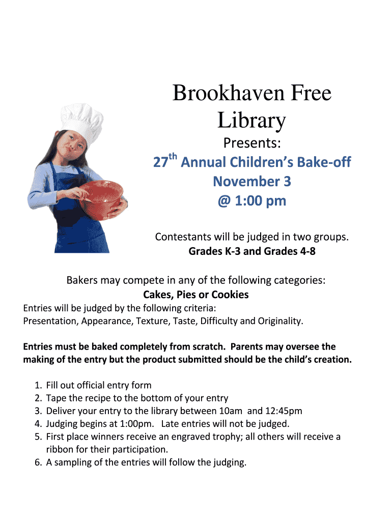 Brookhaven Free Library Presents: 27th Annual Children's Takeoff November 3 1:00 pm Contestants will be judged in two groups. Grades K3 and Grades 48 Bakers may compete in any of the following categories: